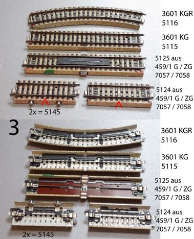 In the picture, from top to bottom: M-contakt track section curved, in the catalogue 1956: No. 3601 KGR, labelled 3601 A )* M-contakt track section, straight