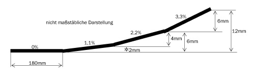 Neigung 3,3% = 6mm auf 180mm, also Steigung von 6 auf 12mm